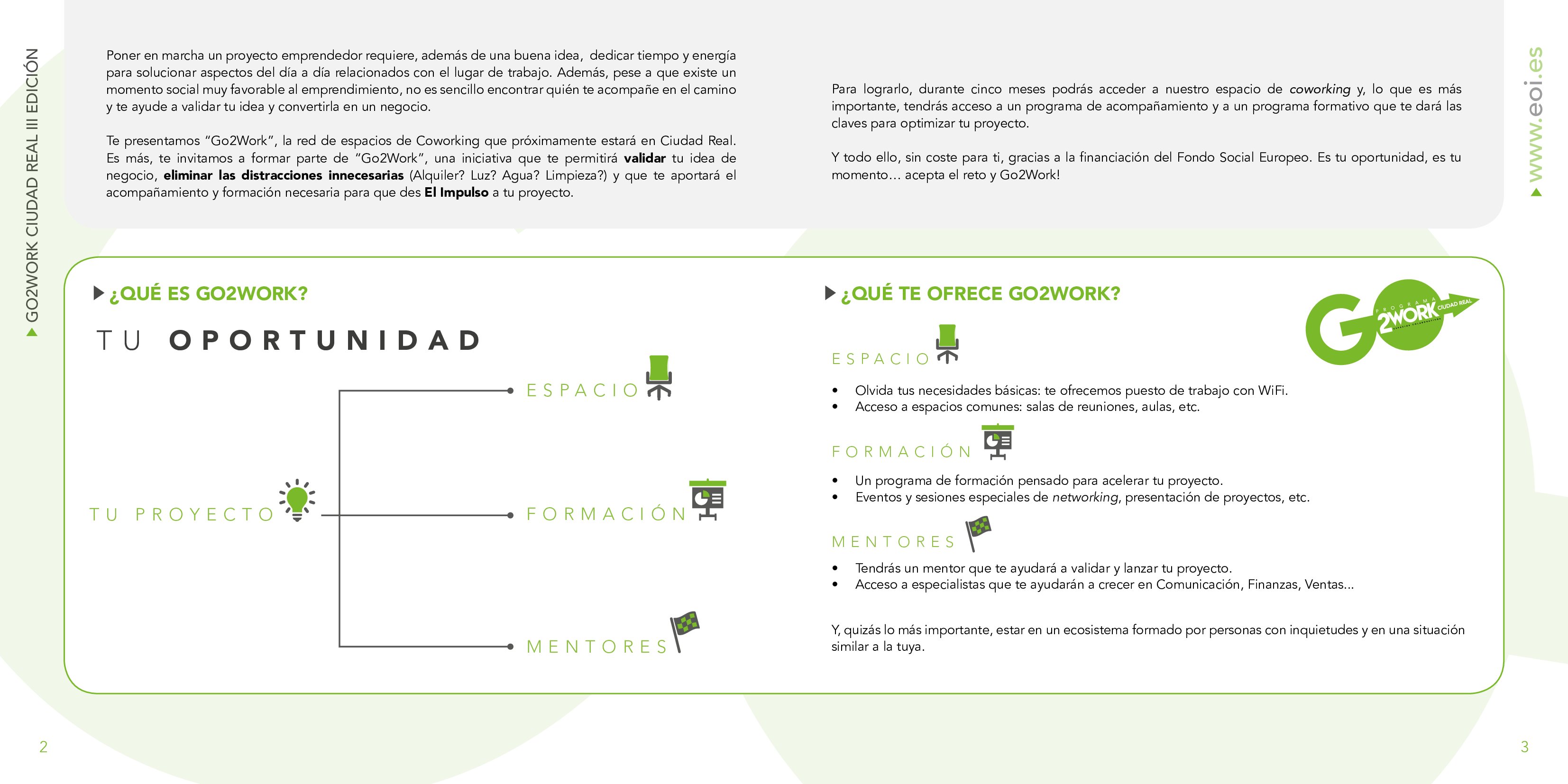 La colaboración entre la Escuela de Organización Industrial (EOI) y la Junta de Comunidades de Castilla-La Mancha junto con la cofinanciación del Fondo Social Europeo ha hecho posible que se abra una nueva convocatoria del programa ‘GO2Work’, que volverá a hacer posible que emprendedores de la provincia puedan tener acceso a espacios gratuitos de coworking en el parque empresarial de la Cámara de Comercio de Ciudad Real en el Polígono de Larache por un periodo de cinco meses a partir de julio. Esta iniciativa está dirigida a proyectos emprendedores innovadores y todos los interesados en acceder a uno de estos espacios de coworking pueden solicitar ya su plaza en la página web https://www.eoi.es/es/espacios-coworking/ciudad-real-3a-edicion