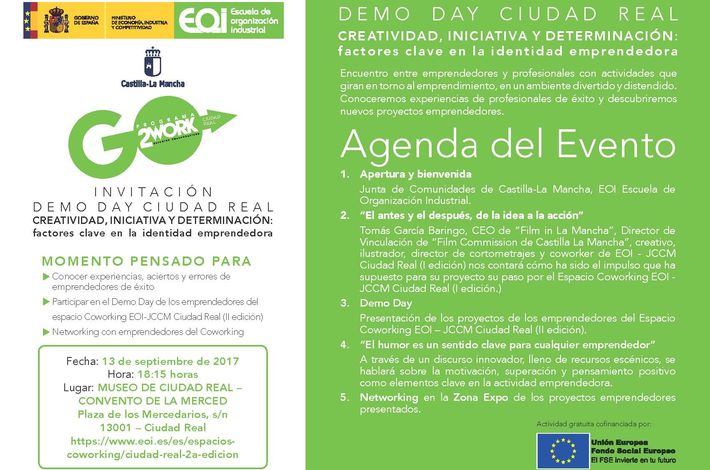 La segunda edición del Programa Go2Work llega a su fin en Ciudad Real y, como en su primera convocatoria, el mismo concluirá con el Demo Day; un evento en el que todos los participantes en esta iniciativa de la EOI, el Fondo Social Europeo y la Junta de Comunidades de Castilla-La Mancha darán a conocer sus proyectos a todos los asistentes.