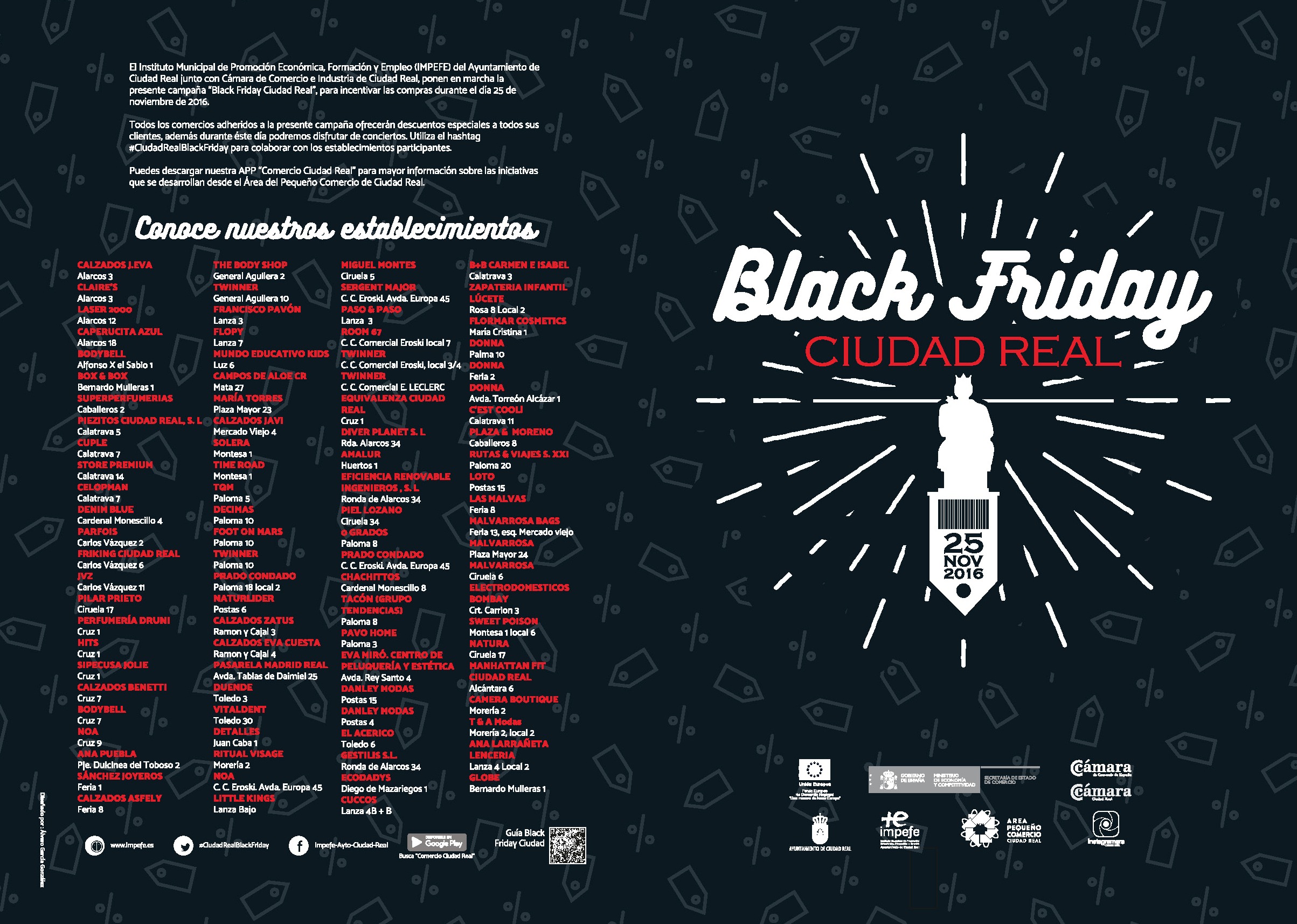 Un centenar de comercios de Ciudad Real ofrecerán descuentos especiales a sus clientes este viernes, 25 de noviembre, dentro de la campaña “Black Friday Ciudad Real”. Se trata de una iniciativa para incentivar las compras dentro del marco del proyecto Dinamización del Centro Comercial Urbano. Programa financiado por la Unión Europea, Fondo Europeo de Desarrollo Regional (FEDER) “Una manera de hacer Europa”, la Secretaria de Estado de Comercio, la Cámara de Comercio de España, la Cámara de Comercio e Industria de Ciudad Real y el IMPEFE.